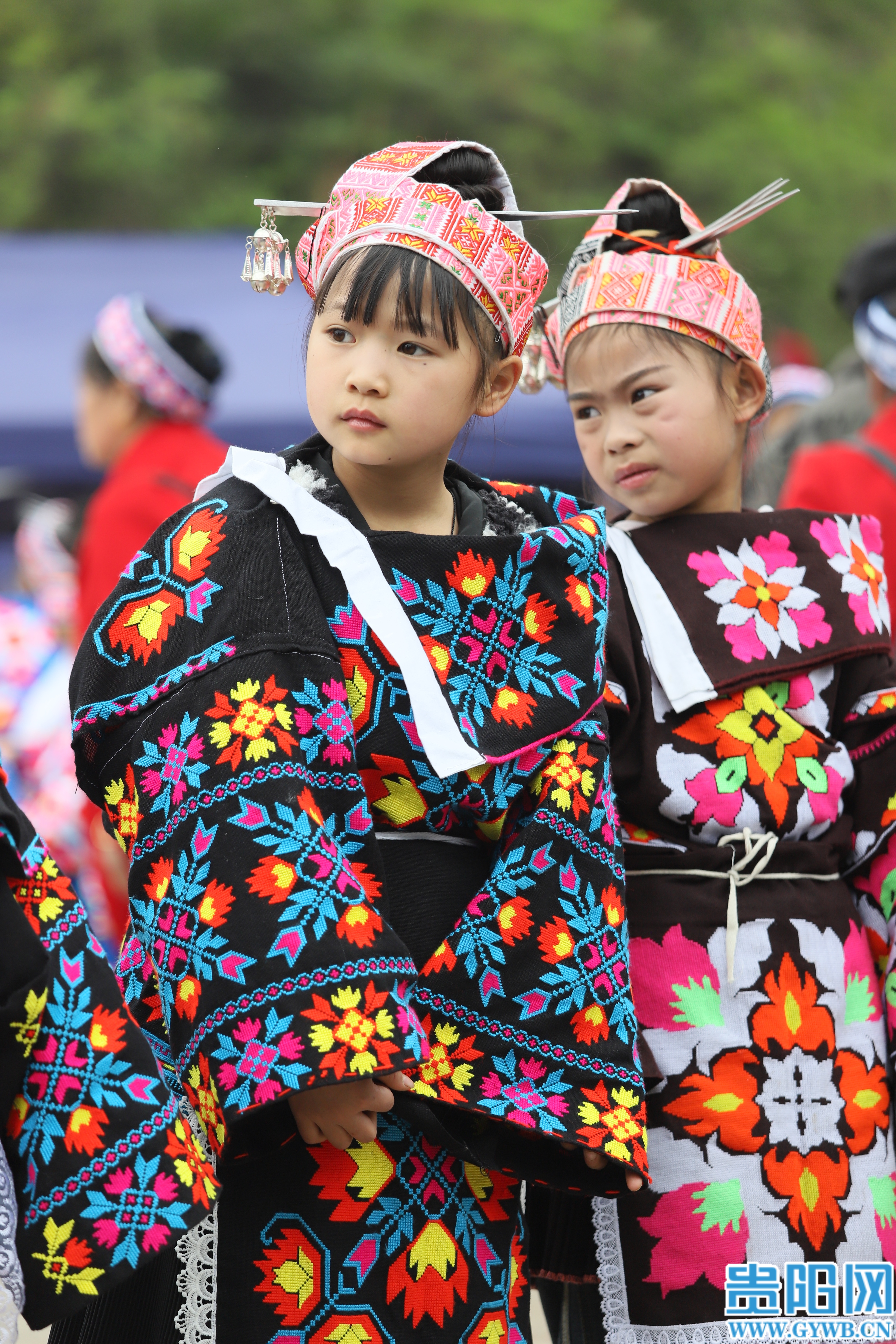 苗族女孩身着节日盛装,手牵手跳舞