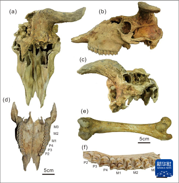 图为在贵州绥阳双河洞区域科考发现羚牛化石的头骨、股骨及上颌齿列的标本图。(受访者供图)