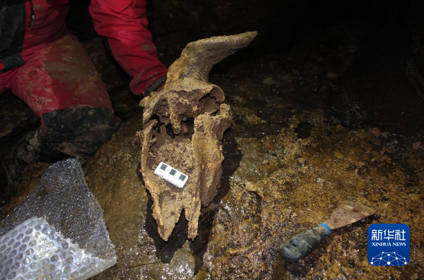 这是在贵州绥阳双河洞发掘现场发现的羚牛头骨。(受访者供图)