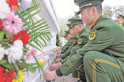 图为4月3日,武警贵阳支队官兵在解放贵州革命烈士纪念碑前敬献鲜花。