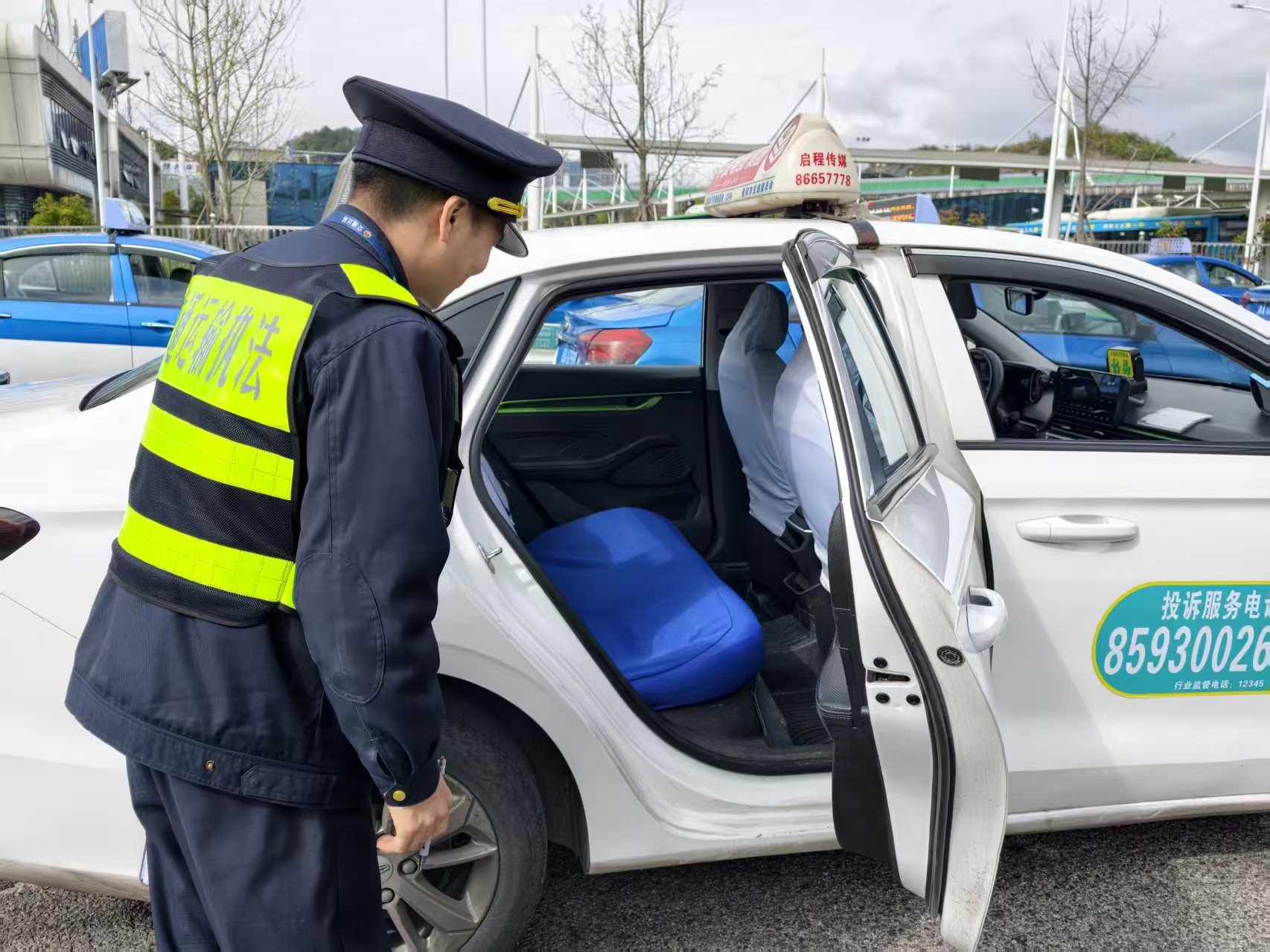 执法人员检查出租车车内卫生