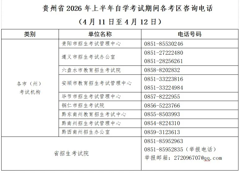 贵州省2026年上半年高等教育自学考试将于4月11日至12日进行。为确保广大考生顺利参考,现将有关事项提醒如下: