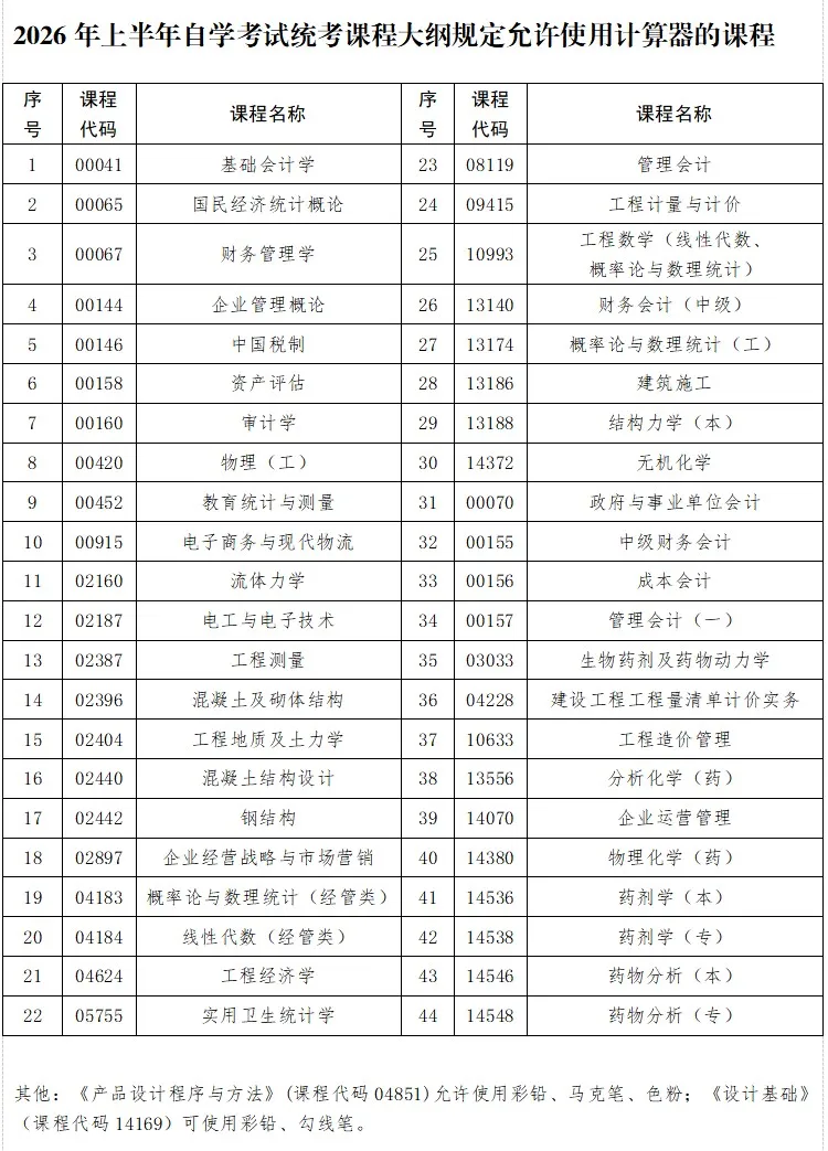 考生可携带不带存储功能的计算器参加部分课程考试,详情见下表。