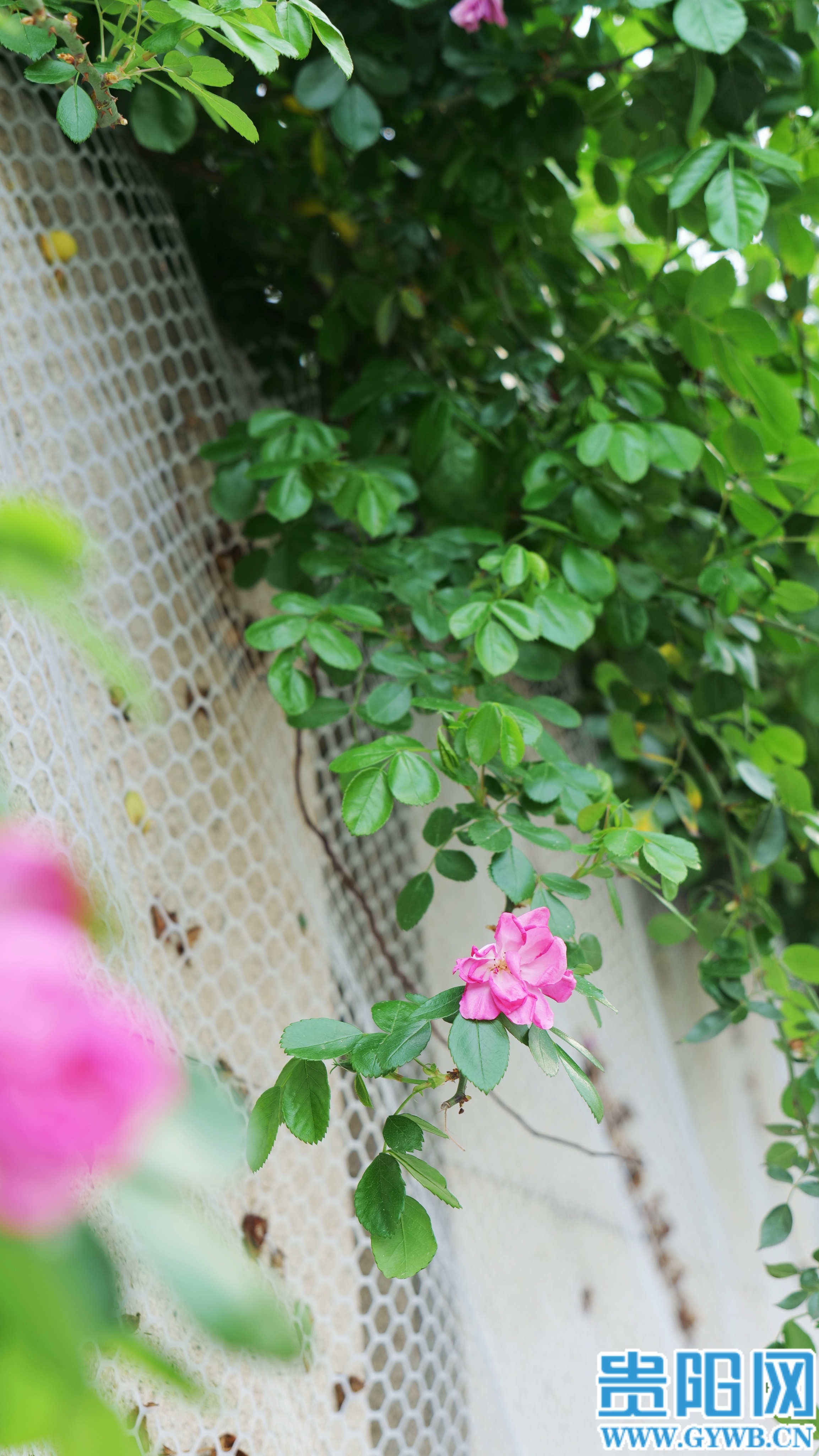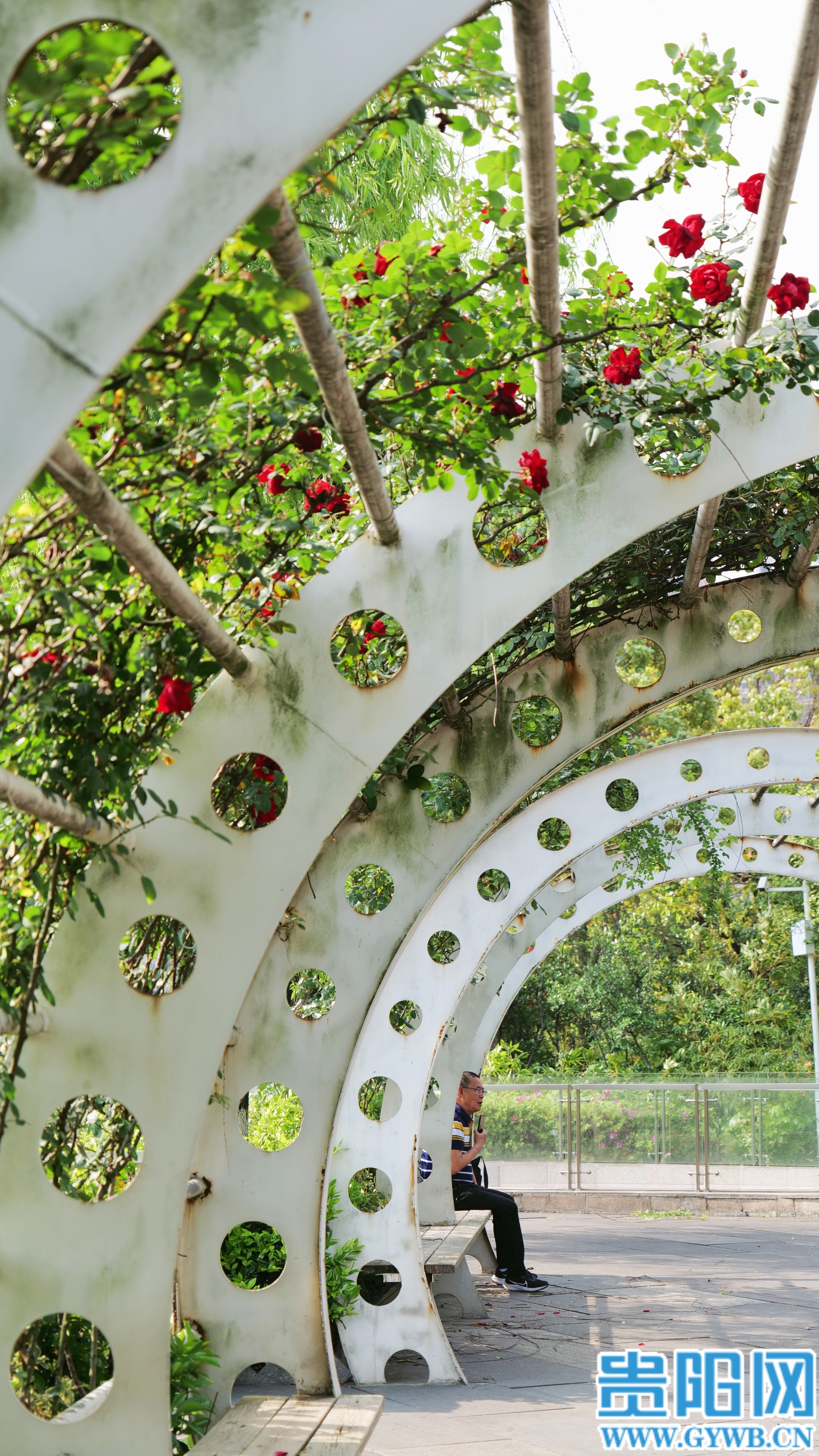 花廊下,有人闲坐谈天享春色,在微风中轻嗅月季的甜香;花径上,游人仰头看晚樱层叠,任花瓣拂过笑颜;长椅旁,老人静坐休憩,蝴蝶围着花丛打转,孩童追逐打闹。