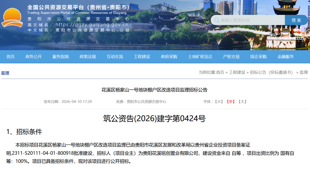 4月10日,贵阳市公共资源交易中心发布花溪区杨家山一号地块棚户区改造项目监理招标公告。