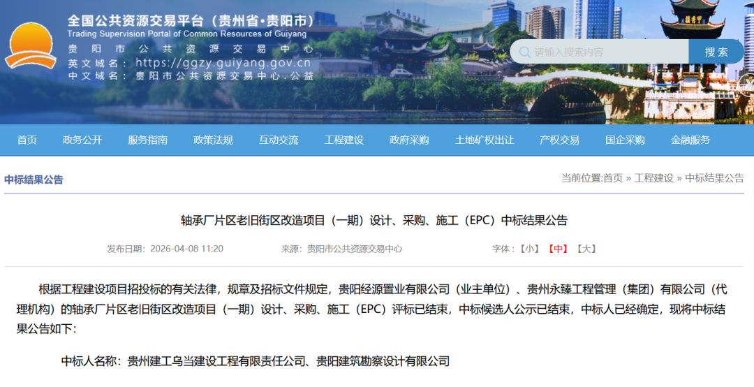 4月8日,贵阳市公共资源交易中心发布轴承厂片区老旧街区改造项目(一期)设计、采购、施工(EPC)中标结果公告。