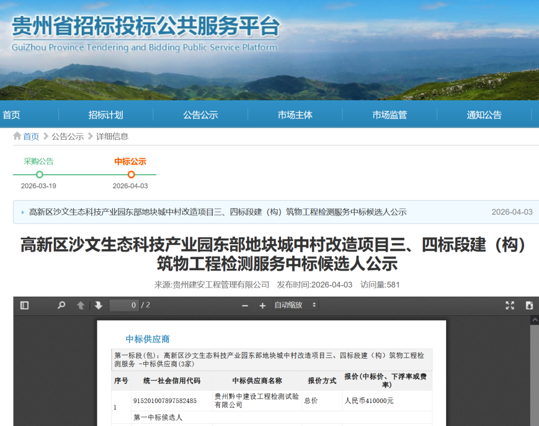 4月3日 ,贵州省招标投标公共服务平台发布高新区沙文生态科技产业园东部地块城中村改造项目三、四标段建(构)筑物工程检测服务中标候选人公示。