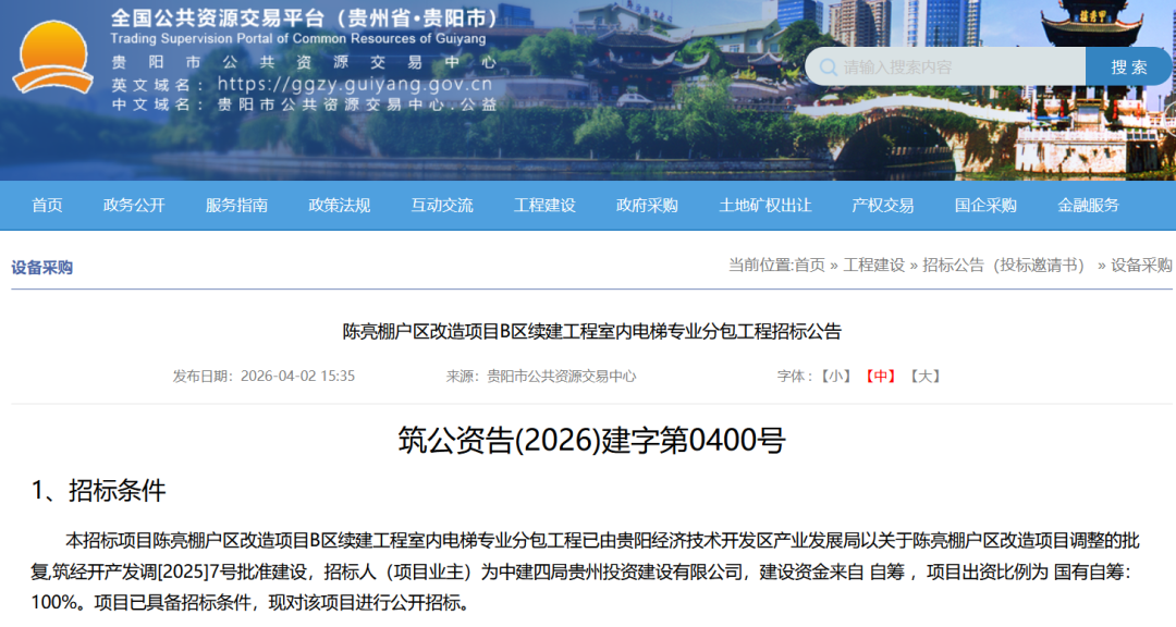 4月2日,贵阳市公共资源交易中心发布陈亮棚户区改造项目B区续建工程室内电梯专业分包工程招标公告。