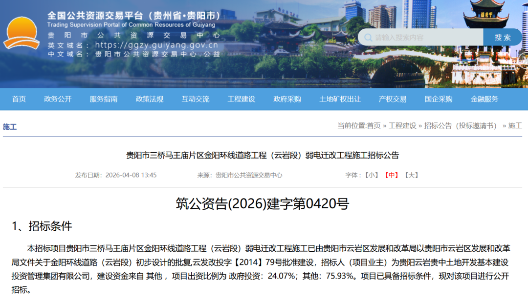 4月8日,贵阳市公共资源交易中心发布贵阳市三桥马王庙片区金阳环线道路工程(云岩段)弱电迁改工程施工招标公告。