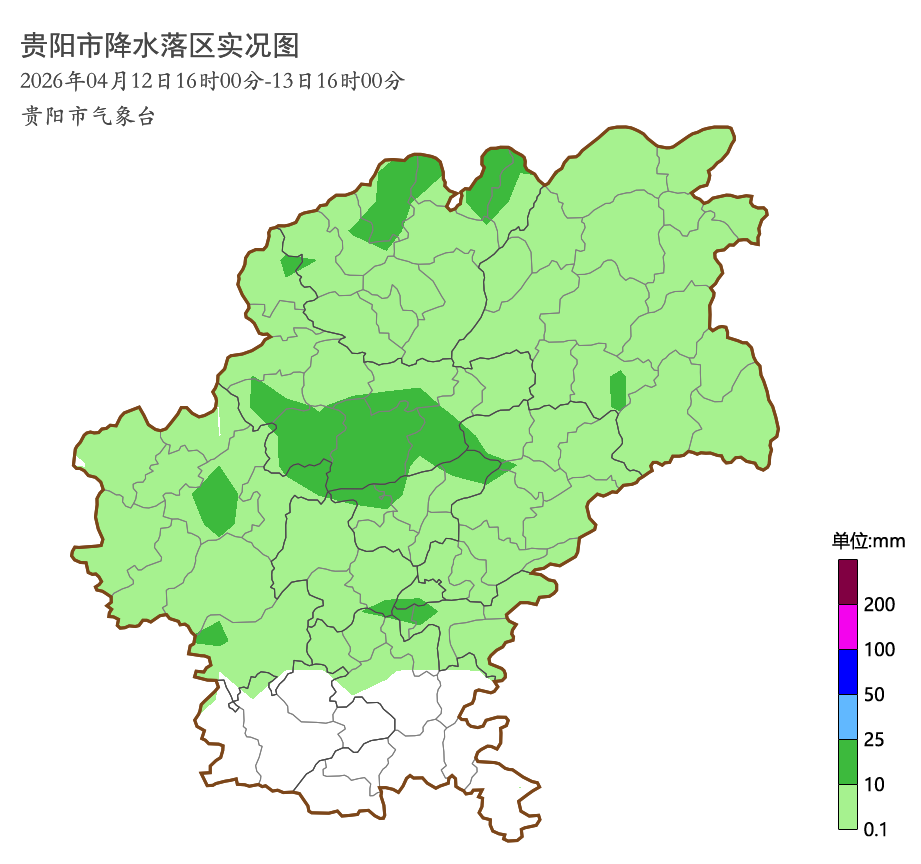 4月12日16时至4月13日16时,贵阳贵安共出现40站中雨;176站小雨。最大降雨量为白云区沙文范家院21.5毫米。