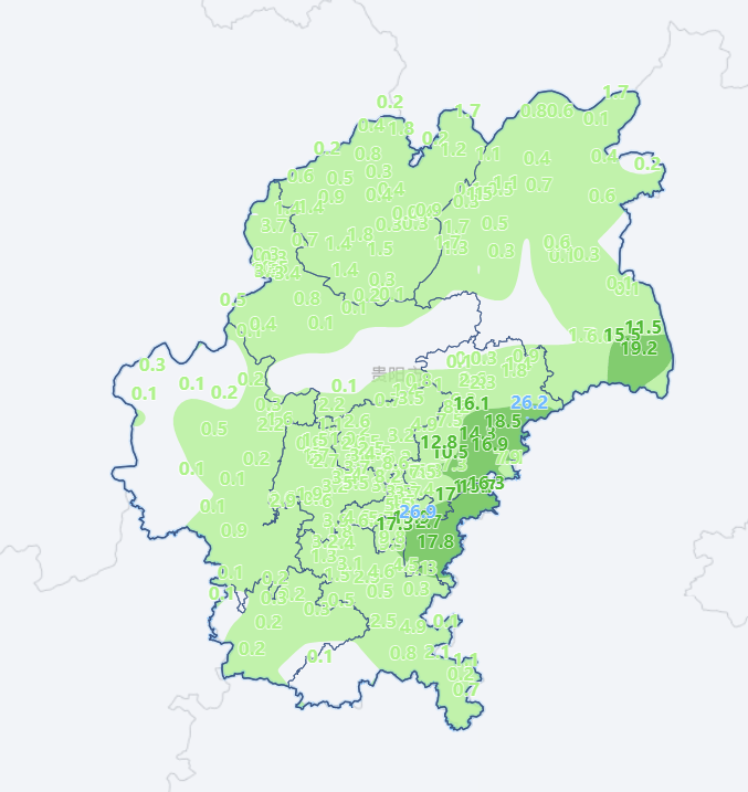 4月15日16时至4月16日16时,贵阳贵安共出现1站大雨,15站中雨,182站小雨,最大降雨量为南明区森林公园26.9毫米。