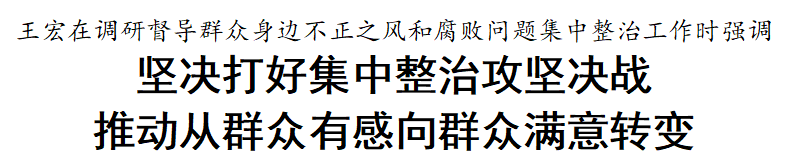 贵阳网·贵阳新闻讯 4月16日,市委副书记、市长王宏调研督导群众身边不正之风和腐败问题集中整治工作。他强调,要深入学习贯彻习近平总书记关于深化整治群众身边不正之风和腐败问题的重要指示精神,始终把人民放在心中最高位置,树立和践行正确政绩观,坚决打好集中整治攻坚决战,推动从群众有感向群众满意转变。