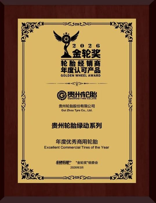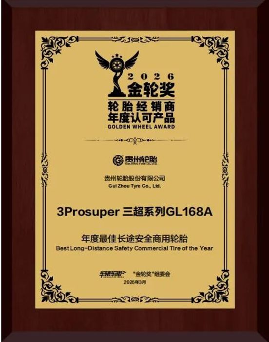 近日,在2026轮胎经销商年度认可产品“金轮奖”颁奖典礼上,贵州轮胎脱颖而出,其三超系列GL168A获得“年度最佳长途安全商用轮胎”,绿动系列获得“年度优秀商用轮胎”。