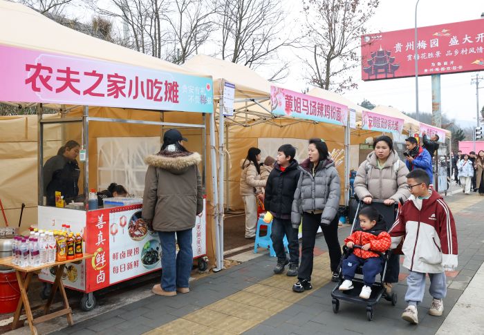 贵州梅园花季期间极大带动消费,图为景区大门的小吃街。石照昌 摄