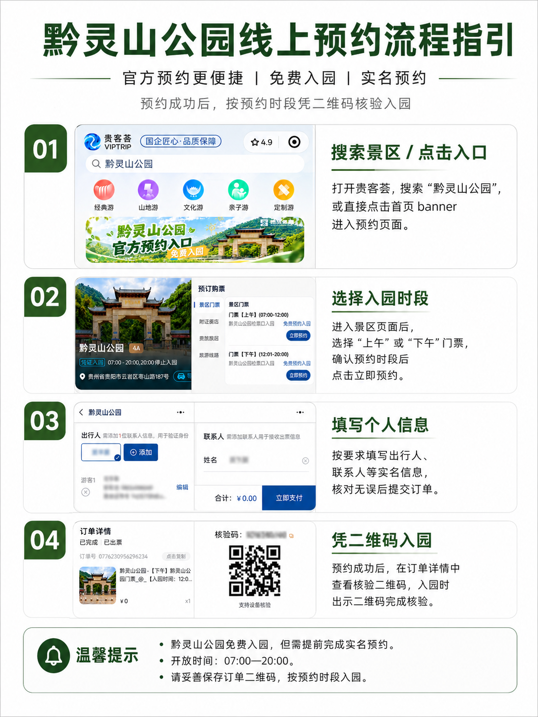记者了解到,为方便游客快速掌握预约流程,公园管理处同步公布了预约指南:游客可通过微信公众号“黔灵山公园”进行预约,也可微信搜索“贵客荟”小程序,搜索“黔灵山公园”后选择“立即预约”,或扫码最下方图中二维码直接进入预约界面,按提示如实填写姓名、身份证号、手机号等个人信息完成实名登记,随后选择预约日期与具体入园时段,提交后即可获取电子预约二维码,入园时凭该二维码或刷身份证即可快速通行。后续公园将不断增加预约通道,方便游客预约。