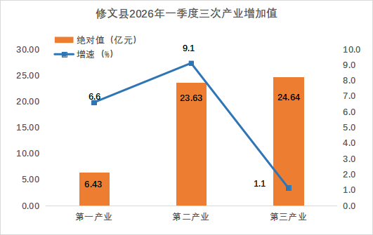 根据区(市、县)生产总值统一核算结果,2026年一季度修文县生产总值54.70亿元,按不变价格计算,同比增长5.1%。分产业看,第一产业增加值6.43亿元,增长6.6%;第二产业增加值23.63亿元,增长9.1%;第三产业增加值24.64亿元,增长1.1%。