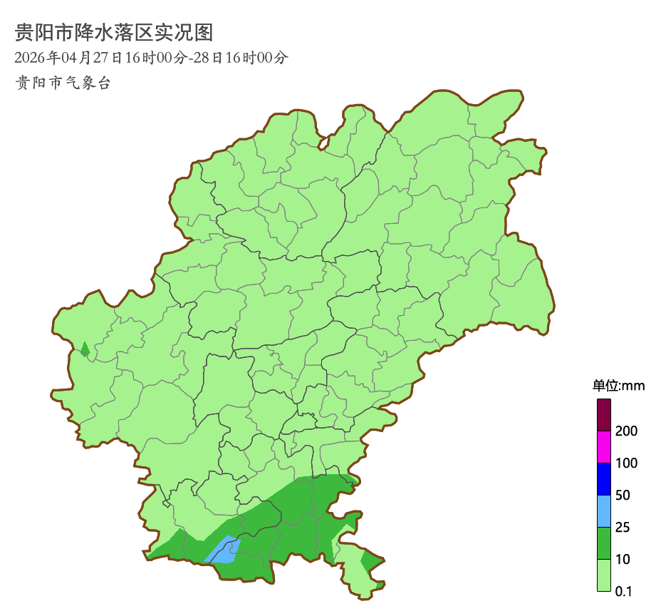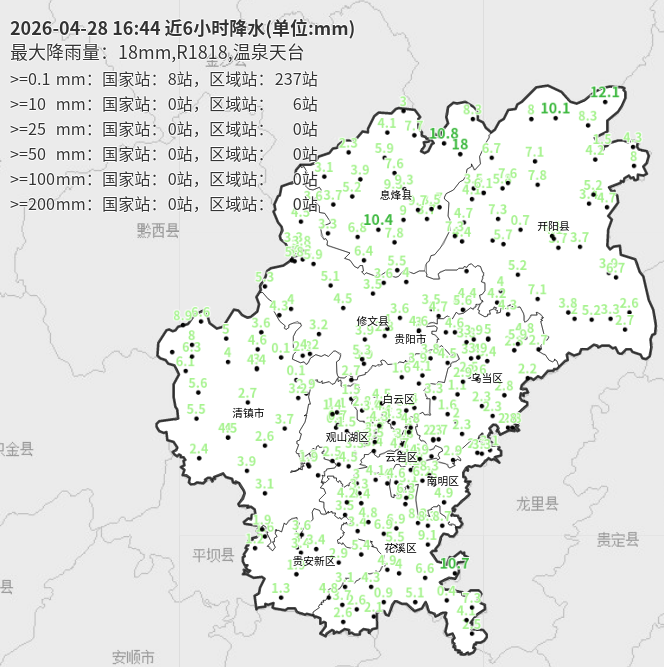 4月27日20时至28日15时,贵阳贵安阴天有阵雨,共出现2站大雨;23站中雨;227站小雨。最大降雨量为花溪区马铃凯坝29.7毫米。
