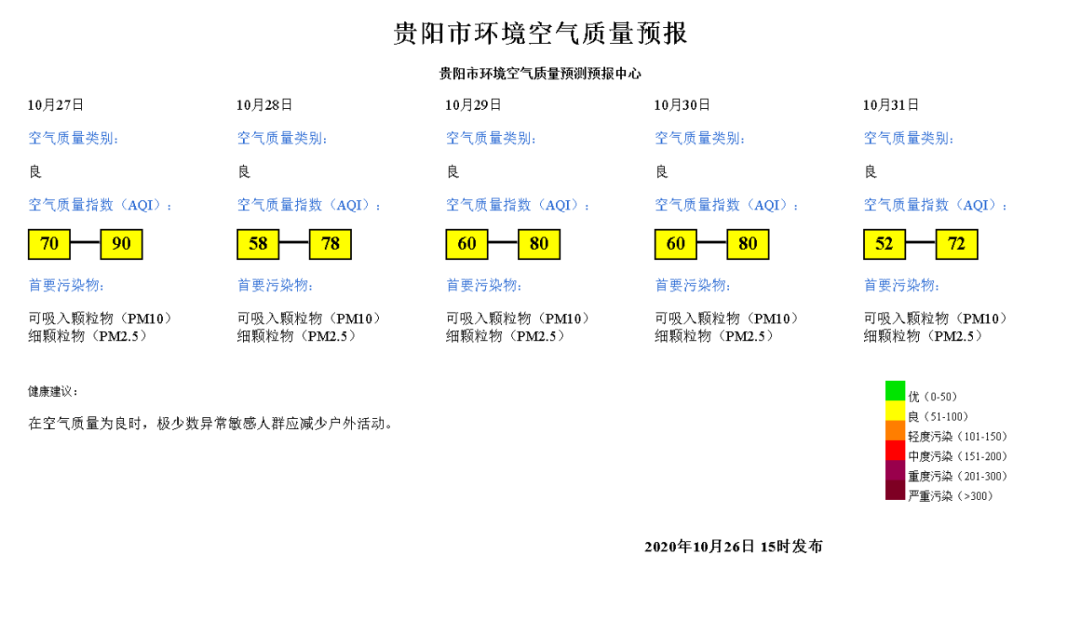 预计贵阳市范围2020年10月27日空气质量指数(AQI)范围:70~90;空气质量类别:良;首要污染物:可吸入颗粒物(PM10),细颗粒物(PM2.5)。