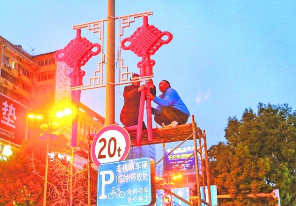 ▲工作人员在延安东路安装中国结装饰物,营造喜庆氛围。
