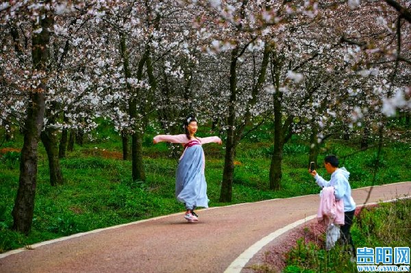 贵阳网讯 3月7日,适逢周末,不少市民游客前往贵安樱花园踏春赏花。在万亩樱花园内,连片的樱花盛开,给连绵的小山“染”上了一层朦胧的嫩粉色,湖山相映,美不胜收。摄影爱好者和游客纷纷驻足欣赏,拍照“打卡”。