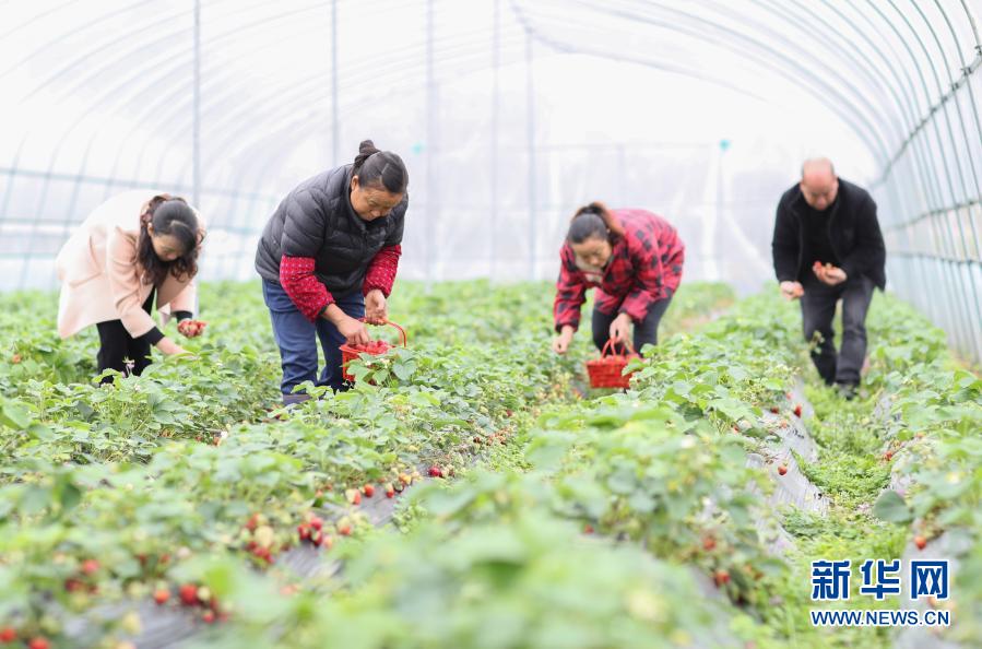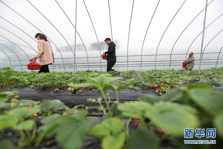 3月20日,在贵州省玉屏侗族自治县皂角坪街道瓮阳村,村民在采摘草莓。