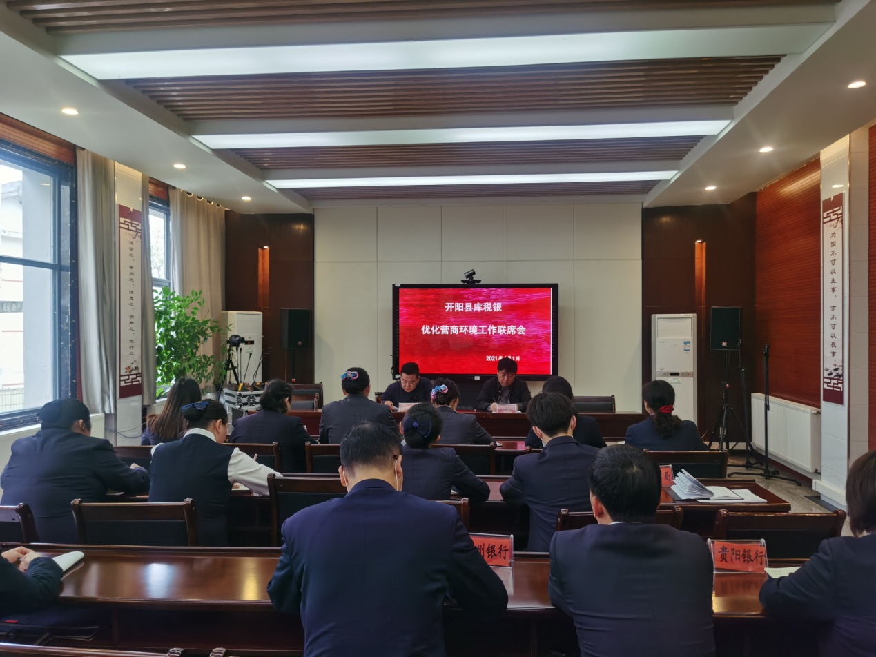 4月1日,开阳县“库税银”优化营商环境工作联席会在中国人民银行开阳支行召开,开阳县税务局副局长王富江、人行开阳支行副行长王洪,工商银行、农业银行、建设银行、邮政储蓄银行等9家商业银行网点负责人、专管员参加会议。