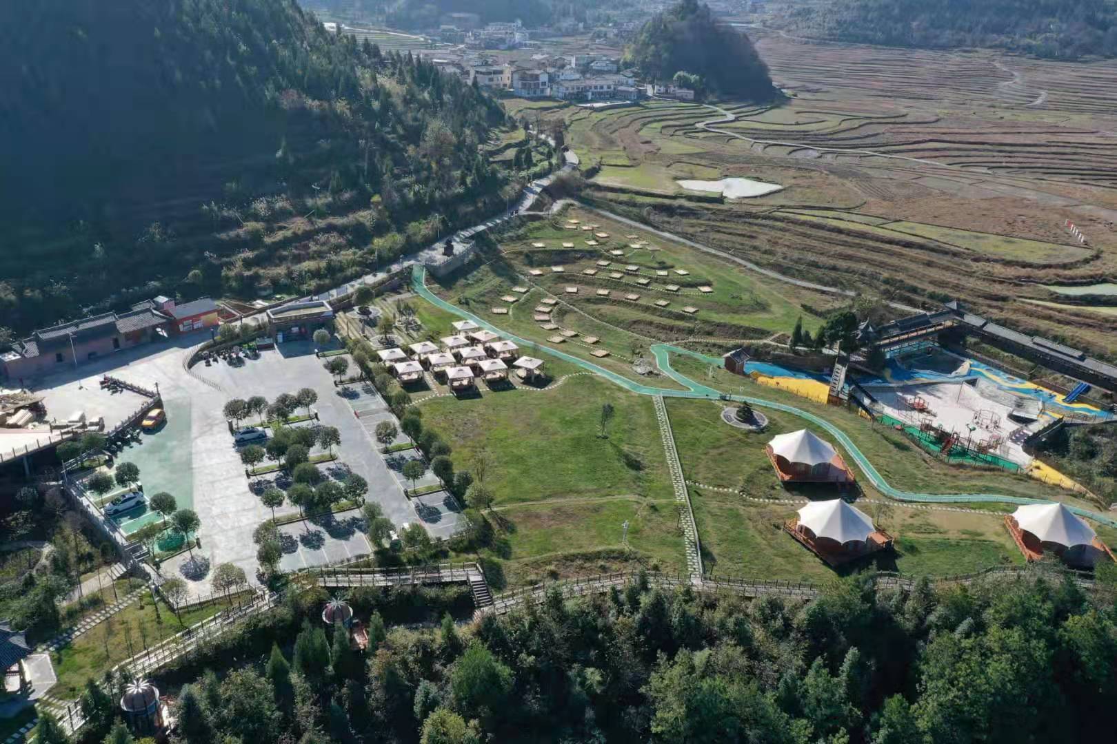 扰绕露营基地一期总面积约40亩,主要分为停车服务区、帐篷露营区、野奢营地区、儿童乐园区、户外休闲区以及室内休闲区六个区域。帐篷露营区设100余顶帐篷露营平台,野奢营地区建设12套装配式度假酒店,儿童游乐区提升为无动力亲子游乐园,户外休闲区为游客提供烧烤、聚会、活动演艺等休闲服务,室内休闲区主要满足休憩、旅游咨询、餐饮等功能需求。目前,基地能容纳600余人。