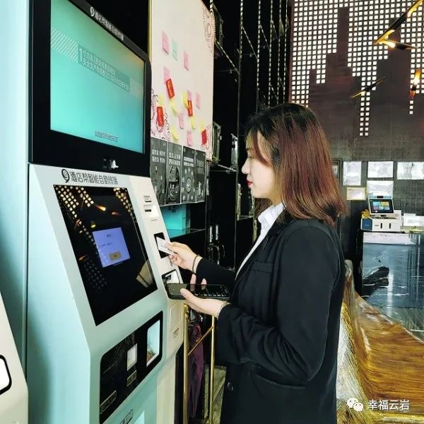 ▲旅客正在云岩区驿元宿“智慧酒店”智能终端机上办理入住。