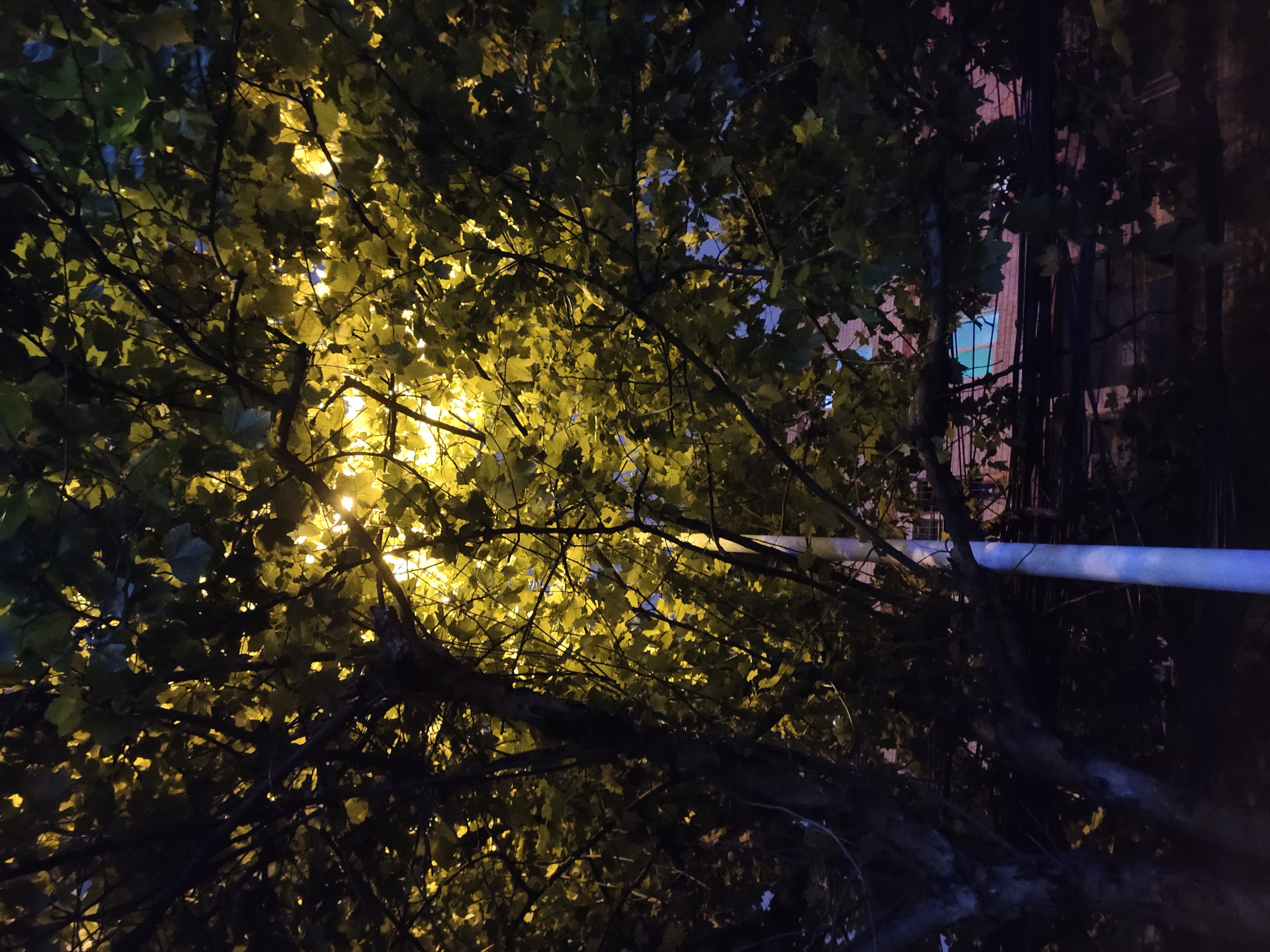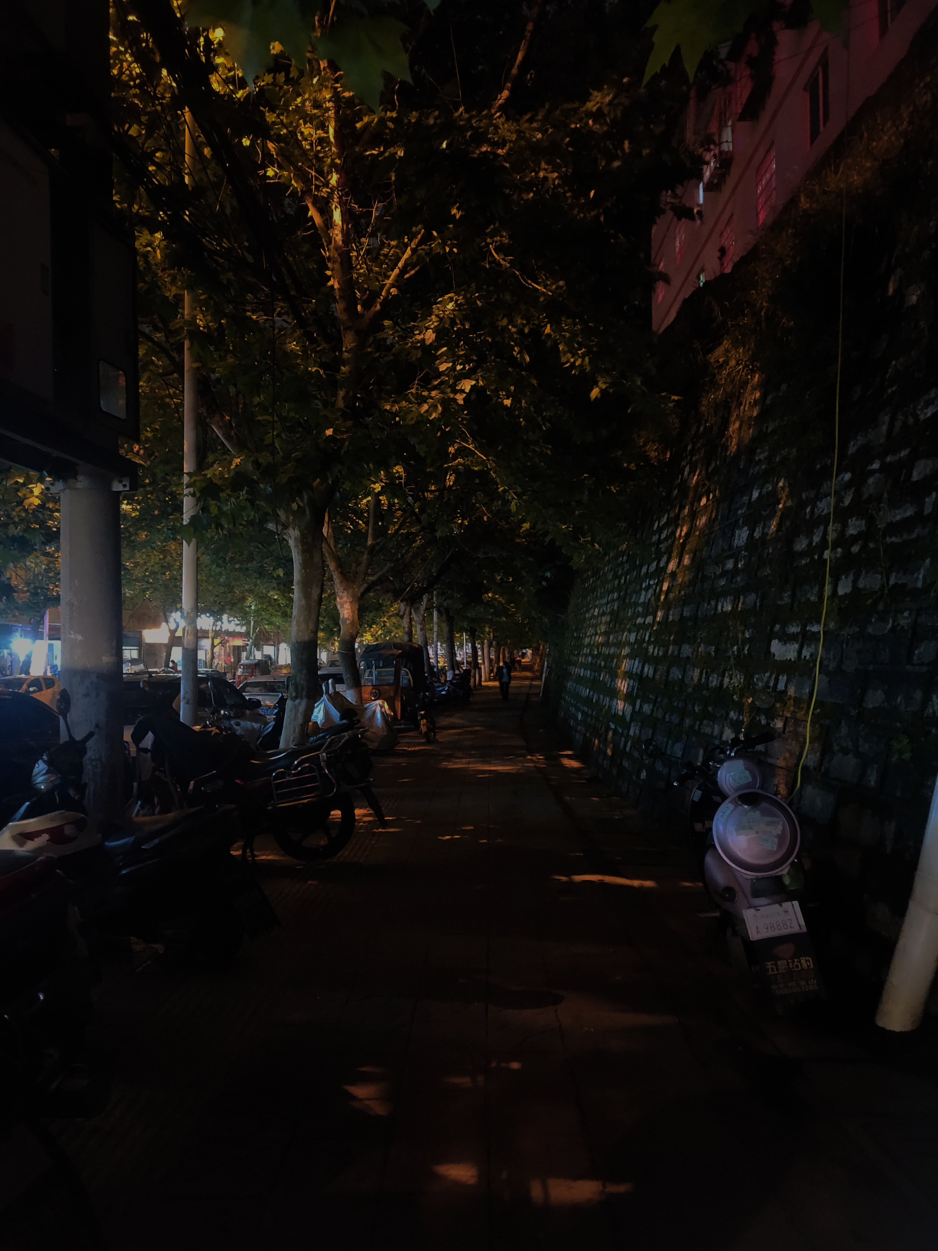 因为路灯被行道树遮挡,人行道上光线昏暗。