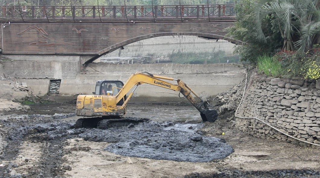 水位回升后,清洁人员正在清理岸边的树枝、枯草