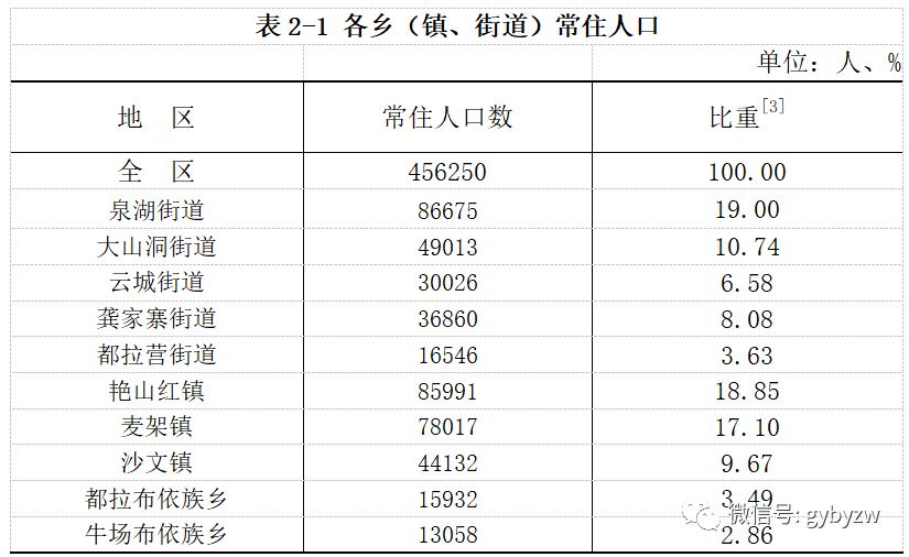 10个乡(镇、街道)中,常住人口超过5万人的有3个,分别为泉湖街道、艳山红镇和麦架镇;在3万人至5万人之间的有4个,分别为大山洞街道、云城街道、龚家寨街道、沙文镇;少于3万人的有3个,分别为都拉营街道、都拉布依族乡、牛场布依族乡。其中,人口居前三位的乡(镇、街道)合计常住人口占全区常住人口比重为54.94%。