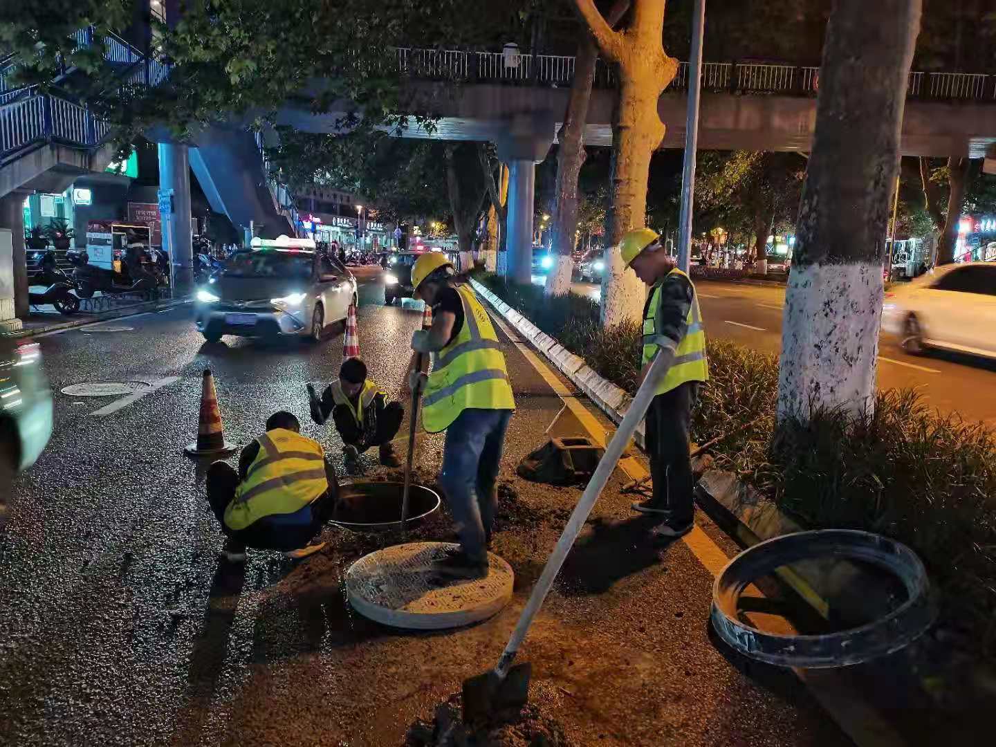 6月4日晚,施工人员正在修复受损电缆井。