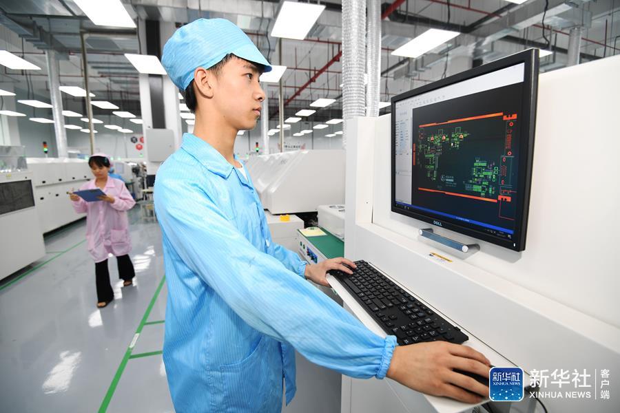 7月27日,在贵阳市南明电子信息产业园内,工作人员正在贵阳臻芯科技有限公司SMT生产线松下贴片机上进行生产作业
