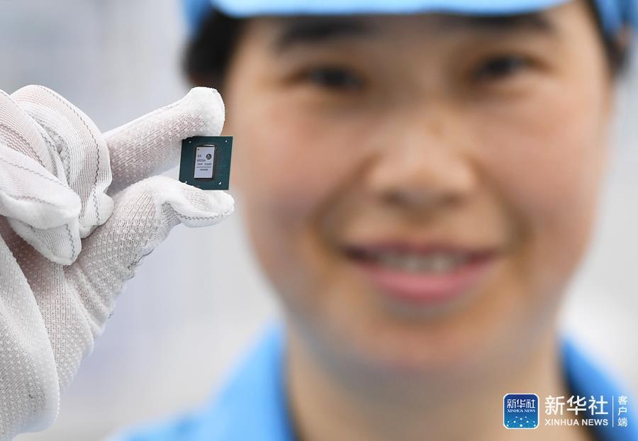 7月27日,在贵阳市南明电子信息产业园内,贵阳臻芯科技有限公司的工人正在展示超高清显示逻辑芯片