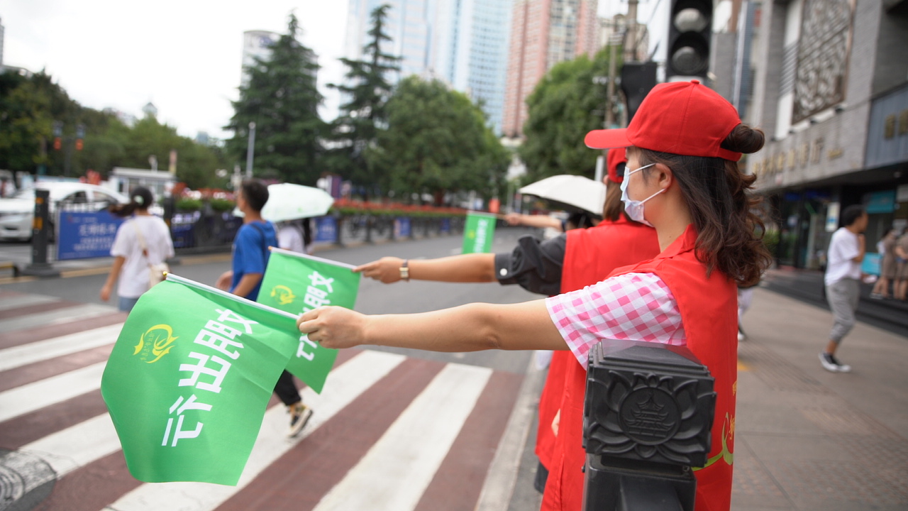 “绿丝带”新时代文明实践志愿者身穿红色马甲,头戴红色志愿者帽,在重要交通路口、公园景点,挥动着手里的文明引导旗,引导行人、车辆规范通行,劝导闯红灯、随意穿行、不礼让行人等不文明行为。