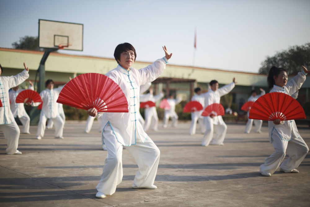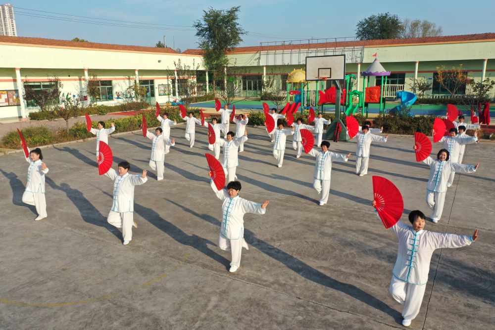 ↑10月24日,山东省青岛市即墨区龙山街道西程哥庄村村民在练习太极扇。新华社发(张光明 摄)