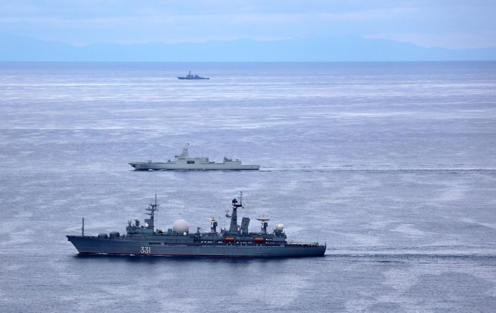 ↑当地时间10月19日,中俄首次海上联合巡航舰艇编队在西太平洋海域联合航渡。这是中国海军南昌舰(下)与俄罗斯海军护卫舰(上)。新华社发(李唐摄)