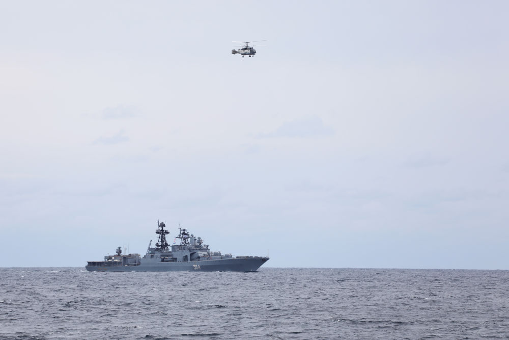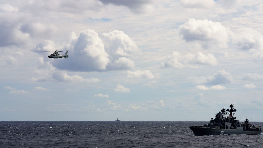 ↑当地时间10月23日,中俄首次海上联合巡航舰艇编队在东海东部海域举行分航仪式。这是中方舰载直升机从俄方“特里布茨海军上将”号大型反潜舰旁飞过。新华社发(孙飞摄)