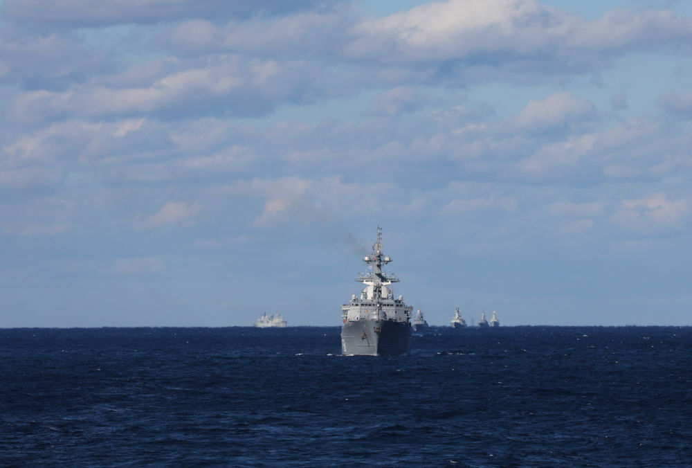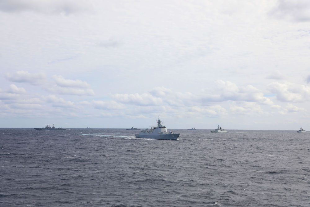 ↑当地时间10月23日,中俄首次海上联合巡航圆满结束。这是参加联合巡航的中国海军舰队部分舰艇。新华社发(孙金钢摄)