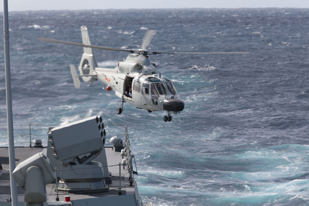 ↑当地时间10月23日,中俄首次海上联合巡航舰艇编队在东海东部海域举行分航仪式。这是中方舰载直升机从南昌舰上起飞。新华社发(韩成摄)