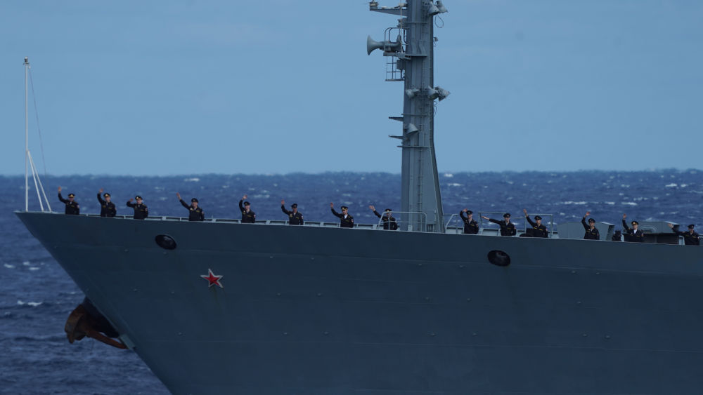 ↑当地时间10月23日,中俄首次海上联合巡航舰艇编队在东海东部海域举行分航仪式,这是俄罗斯海军官兵向我方挥手告别。新华社发(孙金钢摄)