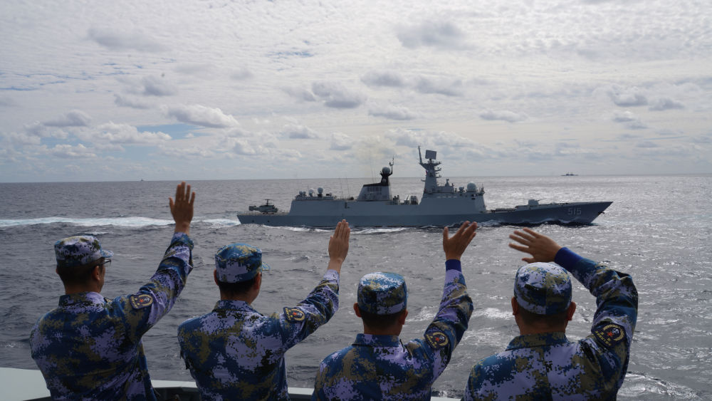 ↑当地时间10月23日,中俄首次海上联合巡航分航仪式结束后,中方参加舰艇分别返回各自军港。这是南昌舰官兵向滨州舰挥手作别。新华社发(孙飞摄)