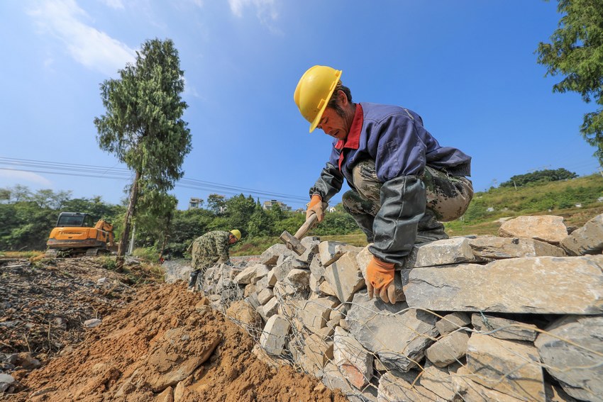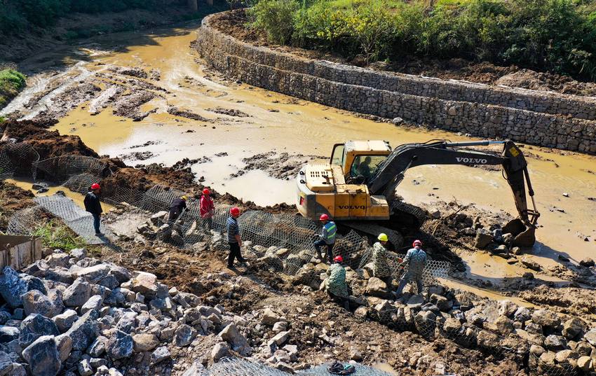 人民网玉屏10月26日电 近日,贵州省铜仁市玉屏自治县抢抓晴好天气,积极开展中小河流域生态综合治理工程建设。在田坪镇小江口村生态综合治理施工现场,工人们在保障安全和质量的前提下,加班加点为项目实施抢进度,现场一派繁忙景象。