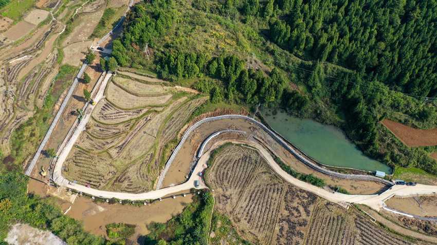 航拍玉屏县田坪镇小江口村生态综合治理施工现场。胡攀学摄