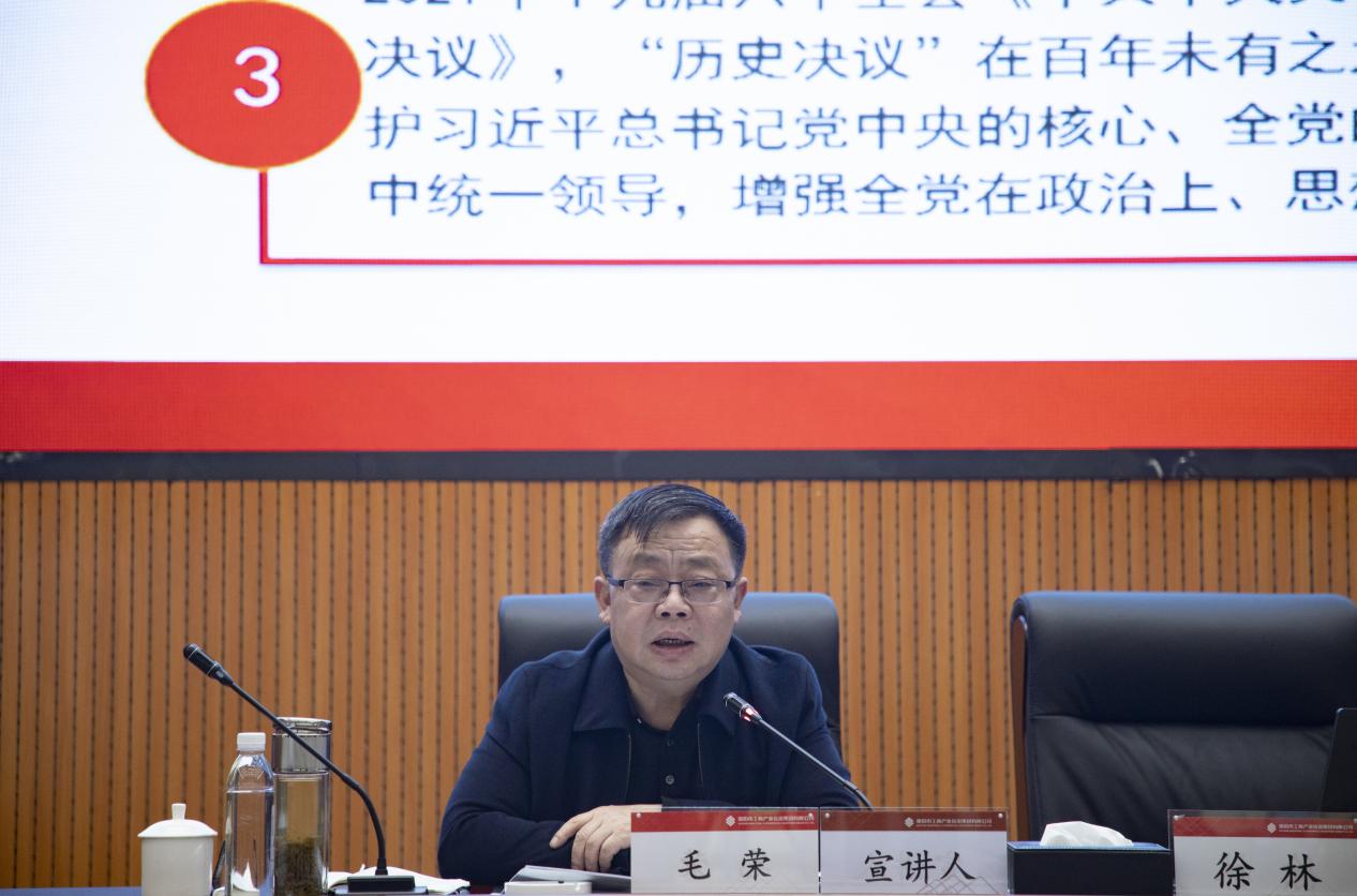 宣讲会上,毛荣首先传达了省委、市委关于学习贯彻全会精神的要求,随后围绕全面总结学习党的百年奋斗重大成就和历史经验,从“会议概况、《中共中央关于党的百年奋斗重大成就和历史经验的决议》序言及7大部分”作了精彩的阐述讲解,重点讲解了“两个确立”的决定性意义、中国共产党百年奋斗历经的“四个时期”创造的“四个伟大成就”、中国共产党百年奋斗的“五方面”历史意义及“十个坚持”的历史经验、新时代党领导人民取得的“十三方面”伟大成就等内容。