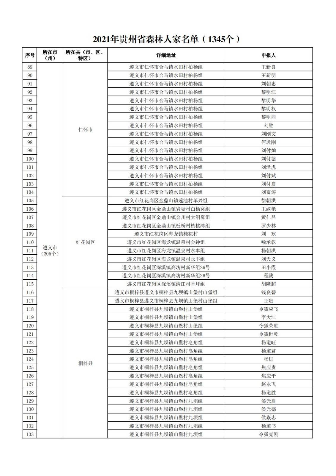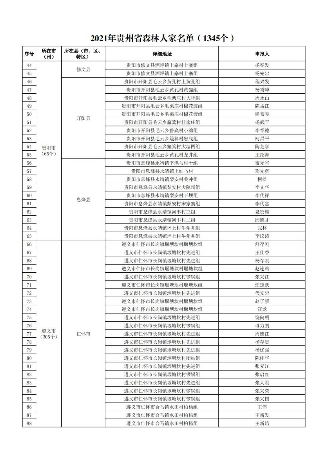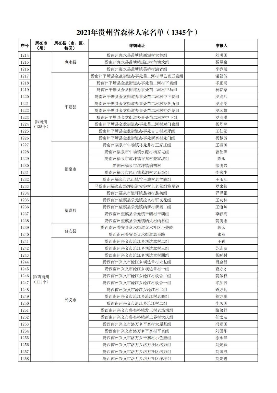 根据各地申报情况,经市(州)审查、现场核查、会议审议、公示等程序,省绿化委员会办公室、省林业局研究决定,授予平塘县“贵州省森林城市”称号;授予贵阳市花溪区黔陶乡、乌当区羊昌镇、修文县谷堡镇、开阳县毛云乡、息烽县永靖镇等85个乡(镇)“贵州省森林乡镇”的称号;授予贵阳市花溪区黔陶乡谷洒村、白云区牛场布依族乡石龙村、清镇市王庄乡小坡村、修文县六屯镇桃源村等223个村“贵州省森林村寨”称号;授予贵阳市花溪区黔陶乡马场村陈肖肖等1345户人家“贵州省森林人家”称号;花溪区久安乡久安村等22个村则获得“贵州省景观优美森林村寨”的称号。