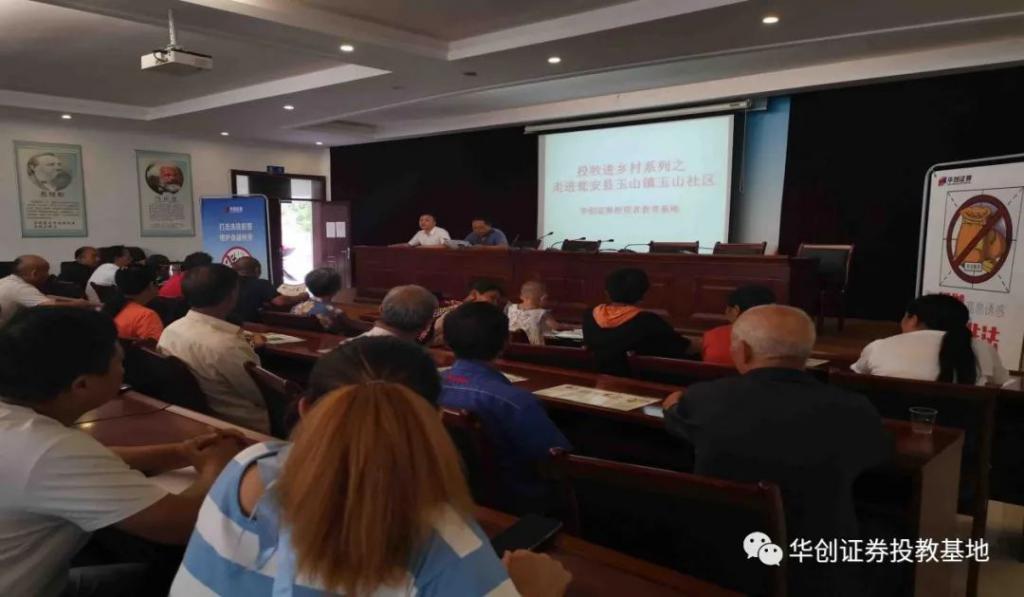 在玉山镇镇长的安排下我们在社区会议室摆放展架,并发放与投教相关的宣传折页及物资,首先镇长向当地百姓介绍了我们华创证券投教基地及来此目的,老百姓表示很支持,然后我们工作人员向当地百姓讲解非法集资及洗钱的危害并通过事实发生的案例让老百姓更加了解这些违法的危害,当地老百姓都很认真听讲,并反应经常接到一些诈骗之类的电话及信息,或朋友介绍用微信扫二维码注册之类的现象,我们工作人员根据老百姓反应的现象做出了正确的讲解,并告诫他们不要贪便宜,谨慎保护好自己的信息,引导他们树立正确的消费观和投资理财理念;然后镇长做了活动总结并再三告诫老百姓要正确消费正确理财,谨慎保护好自己的信息。此场讲座得到了玉山镇政府干部及老百姓的肯定,并对我们表示感谢!