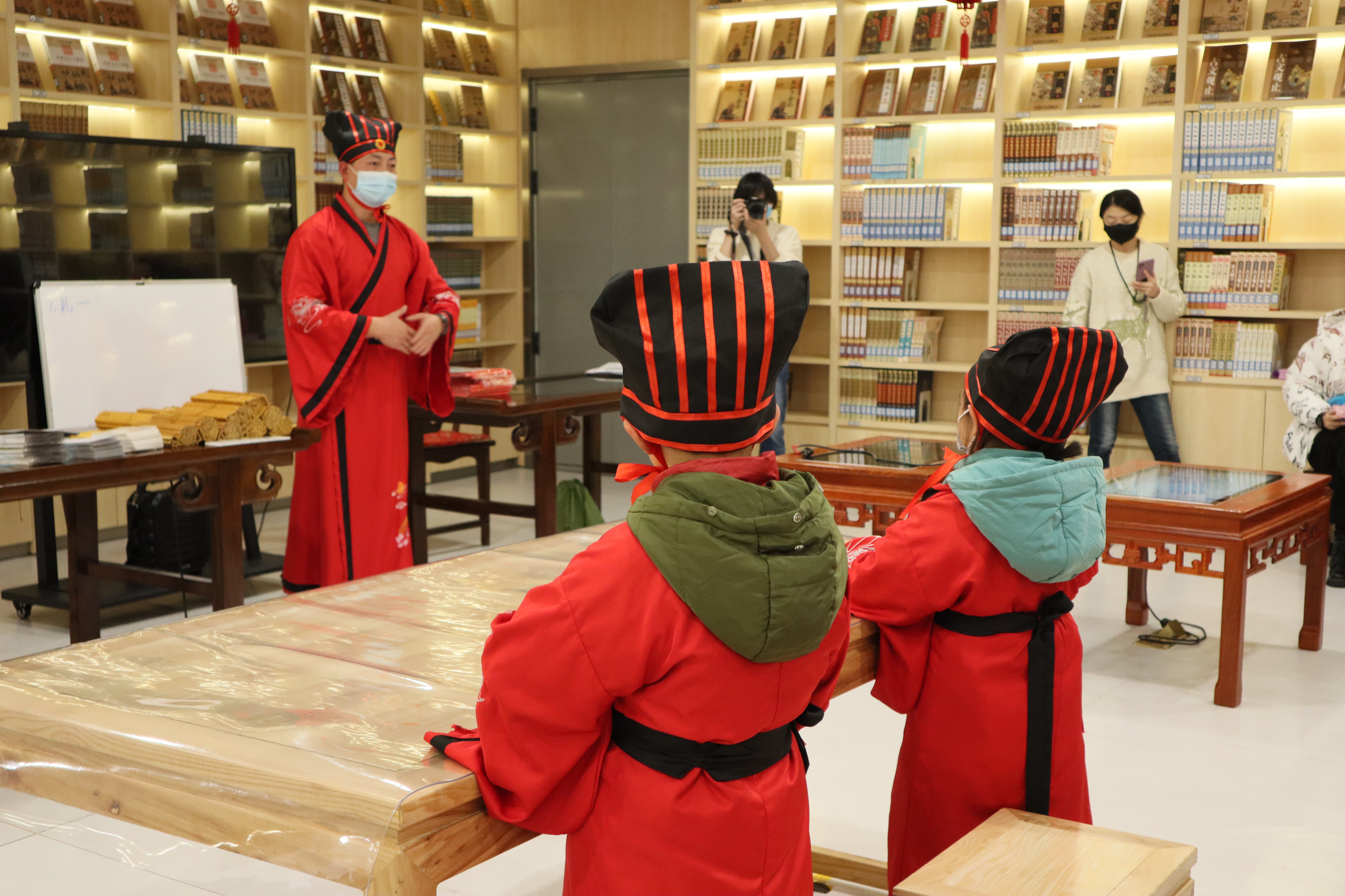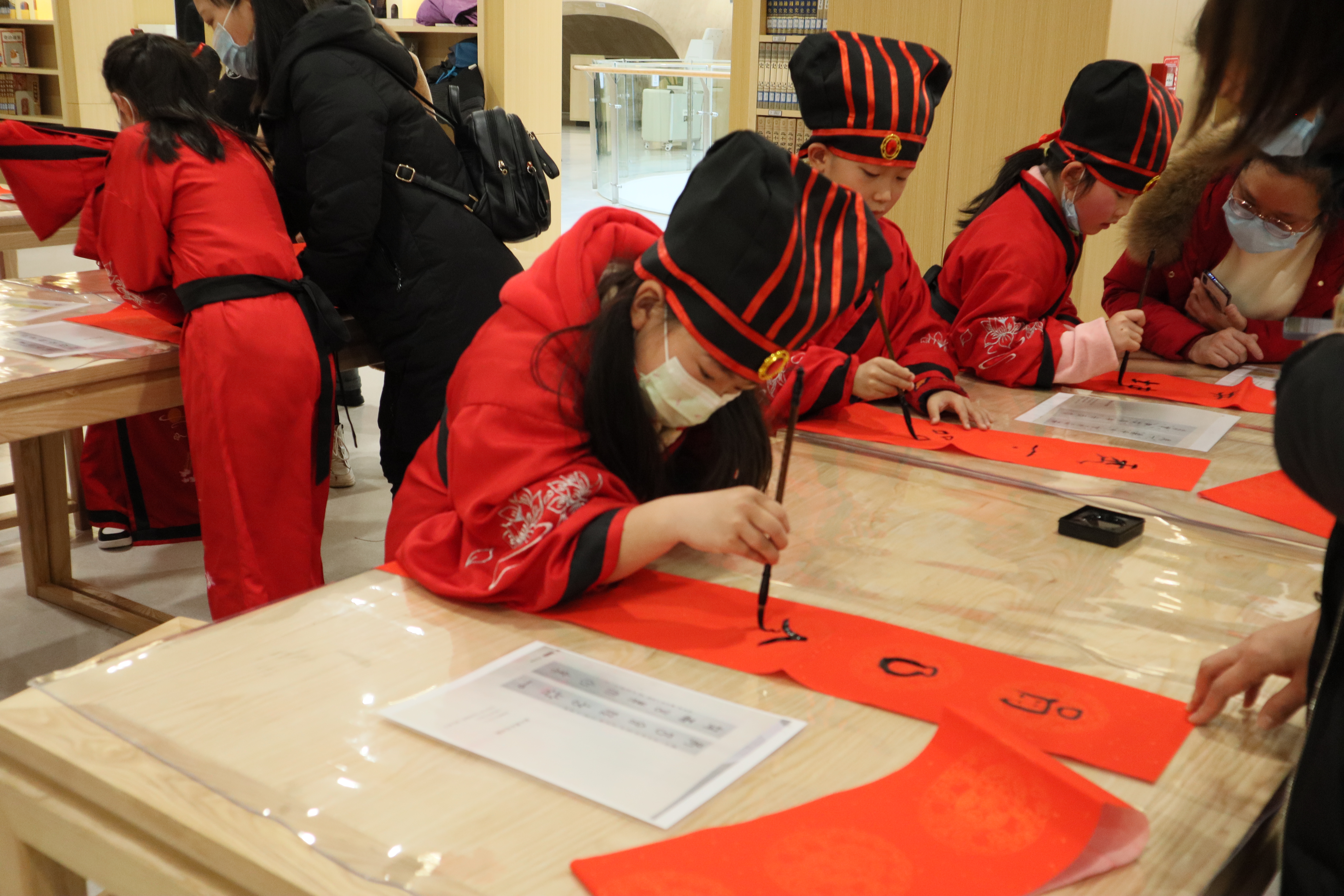 当天活动现场,老师为参加活动的20名同学准备了传统汉服,穿上了汉服的他们跟着老师有模有样地开始了解中国传统礼仪、诵读经典文学、探秘非遗水书魅力,在家长的帮助下,同学们学习了对联的书写并为长辈送上新春祝福,大家都感受到了浓浓的年味。