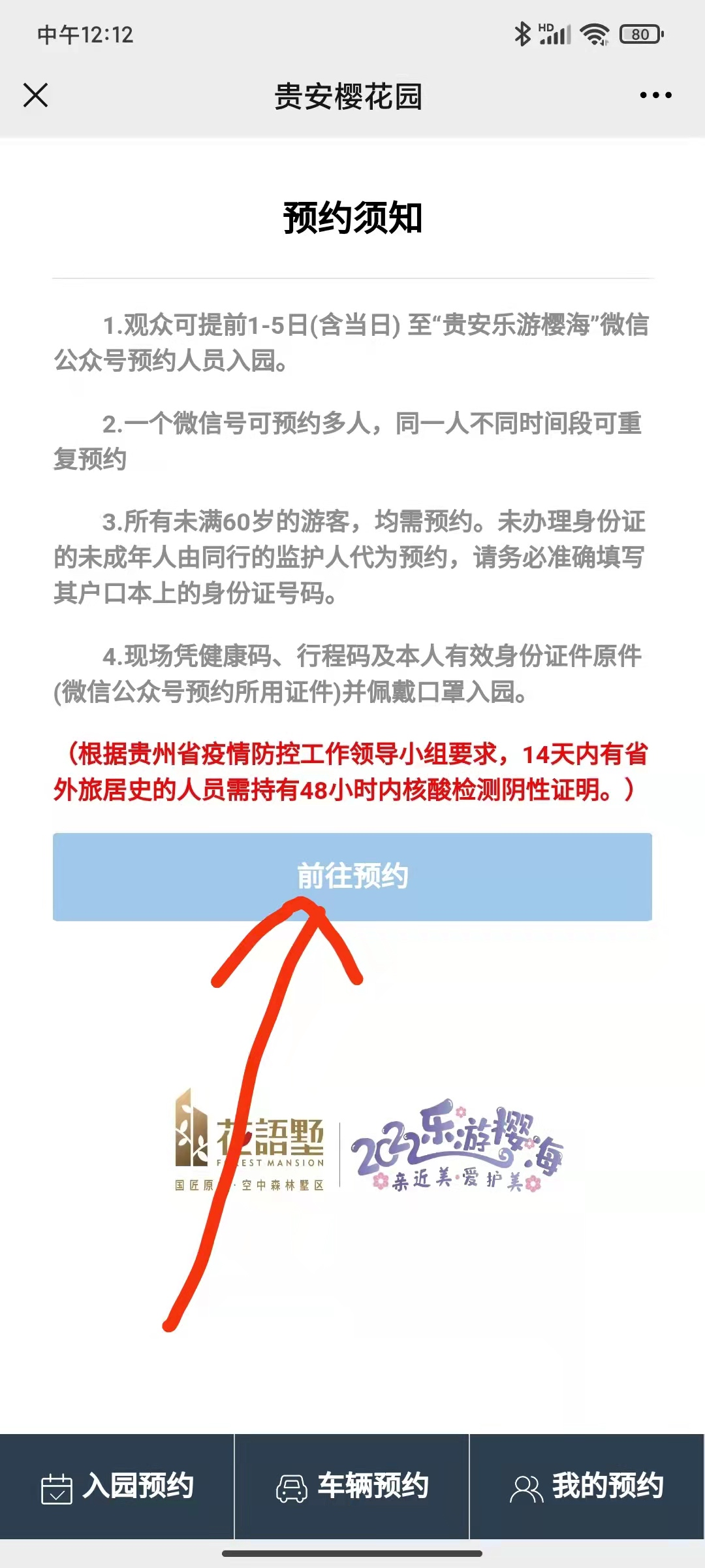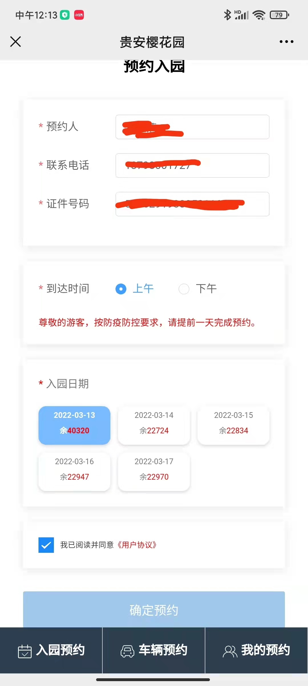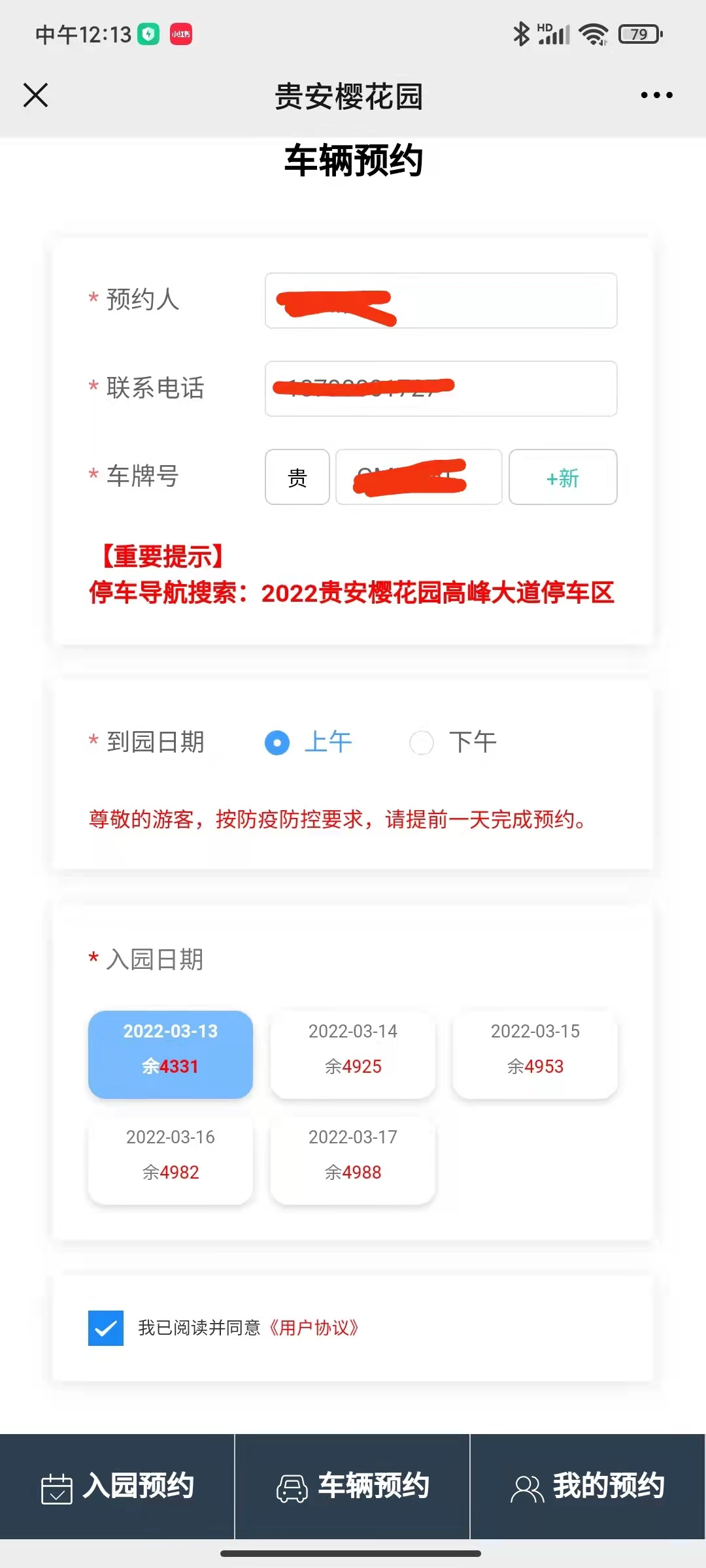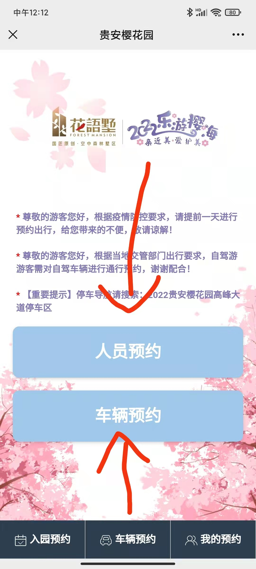 而对于自驾游的市民游客,其实预约方式同样简便,同样以“贵安乐游樱海”为例,点开“贵安乐游樱海”,在该页面左下角再点开预约入园并选择贵安樱花园打开,在该页面点开车辆预约后点击前往预约,然后在该页面依次输入预约人姓名、联系电话、车牌号,选择到达时间(上午或者下午),并选择入园日期(目前可以提前5天预约入园),最后勾选我已阅读并同意《用户协议》并确定预约即可完成车辆预约。预约完成后市民游客还可以再开“贵安乐游樱海”,在该页面左下角点开预约入园并选择贵安樱花园打开,在该页面右下角点开我的预约即可看到刚才自己已完成的预约入园信息。
