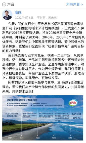 实现碳达峰、碳中和,是我国实现可持续发展、高质量发展的内在要求,也是推动构建人类命运共同体的必然选择。多年来,伊利一直非常重视实现碳达峰、碳中和,用实际行动引领全产业链的减碳工作。早在2007年,潘刚就率先提出“绿色领导力”,并在2009年进一步升级为伊利的“绿色产业链战略”。自2010年起,伊利连续12年开展企业内的全面碳盘查,成为行业内第一家开展碳盘查的企业。2020年10月24日,伊利在行业内第一家响应国家“3060”双碳目标,率先承诺实现碳中和。2021年12月31日,伊利启动建设全国首个零碳五星示范区——“呼和浩特·伊利现代智慧健康谷零碳五星示范项目”。今年,中国食品行业的首个“零碳工厂”、中国首款“零碳牛奶”、中国奶粉行业前2家“零碳工厂”先后在伊利诞生。